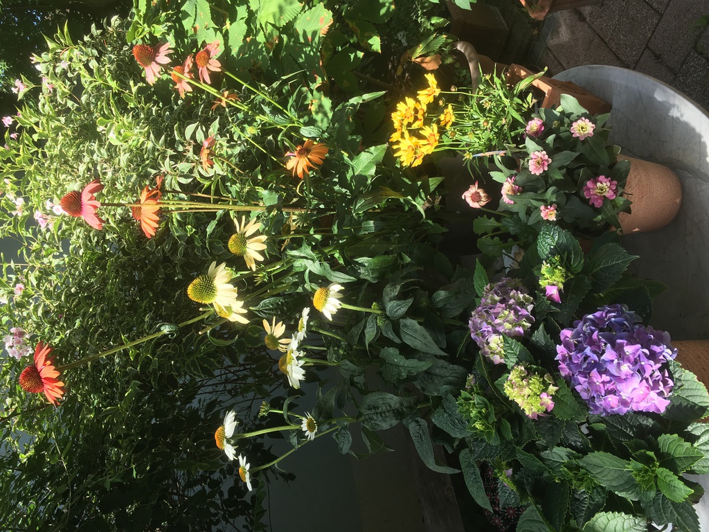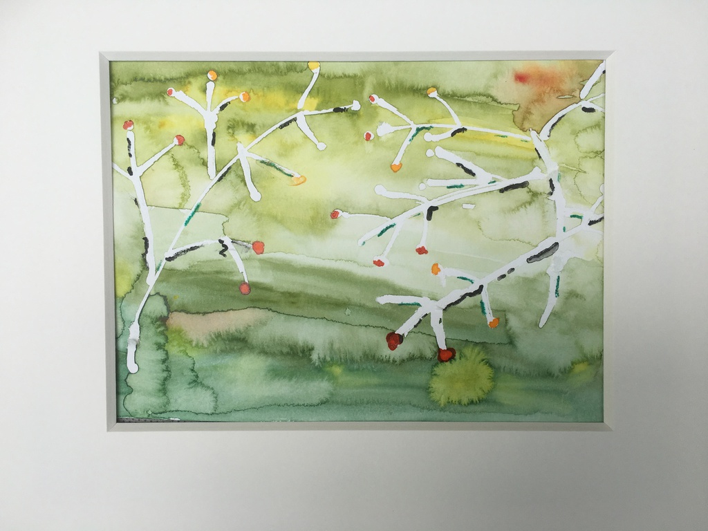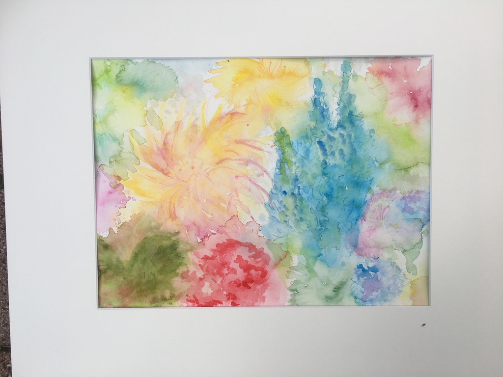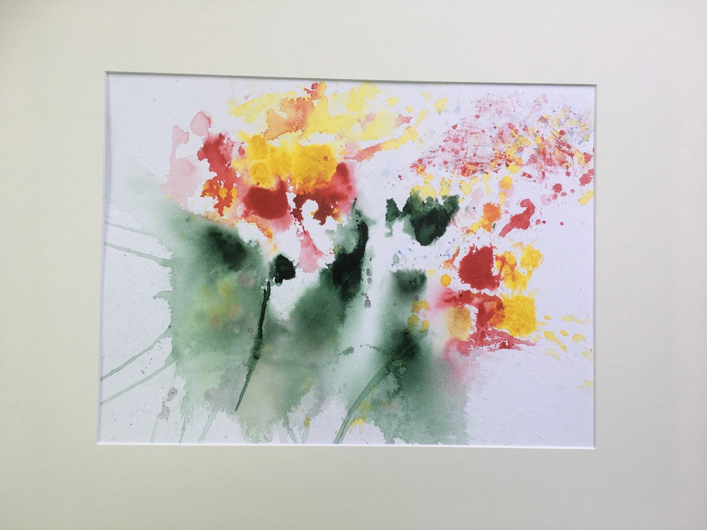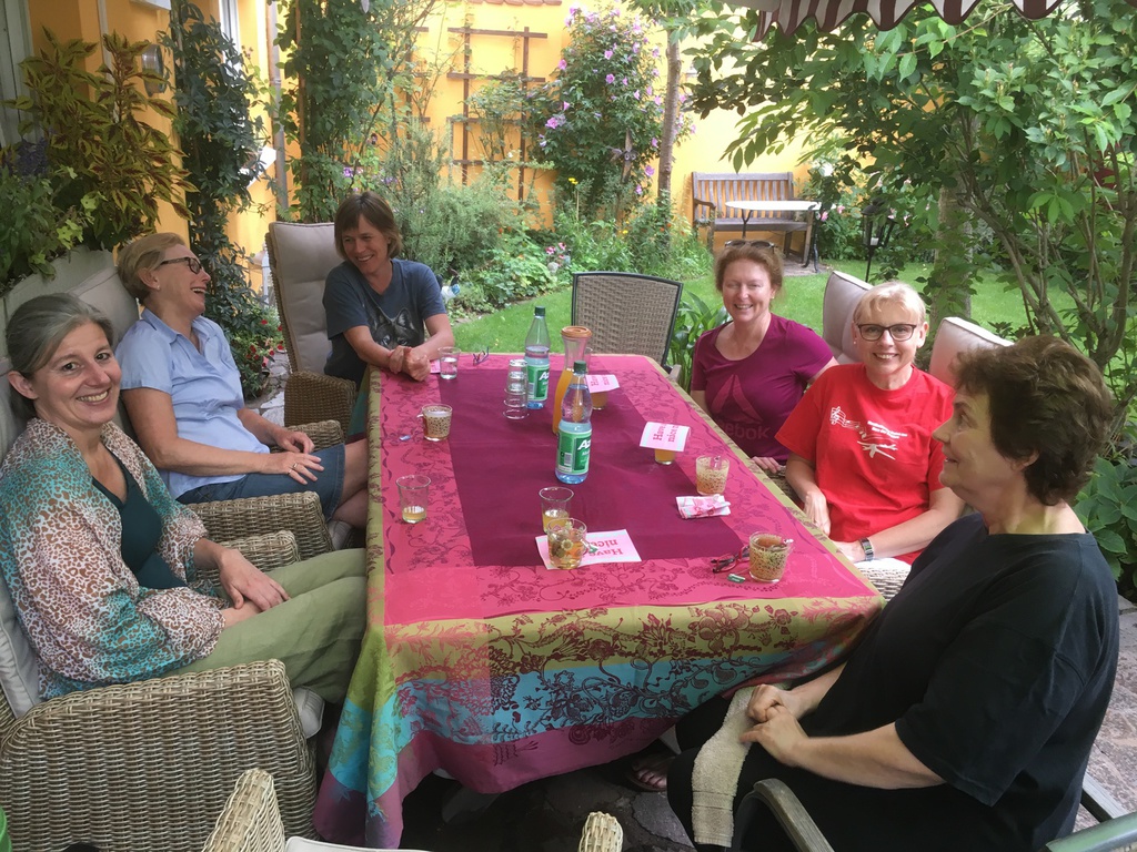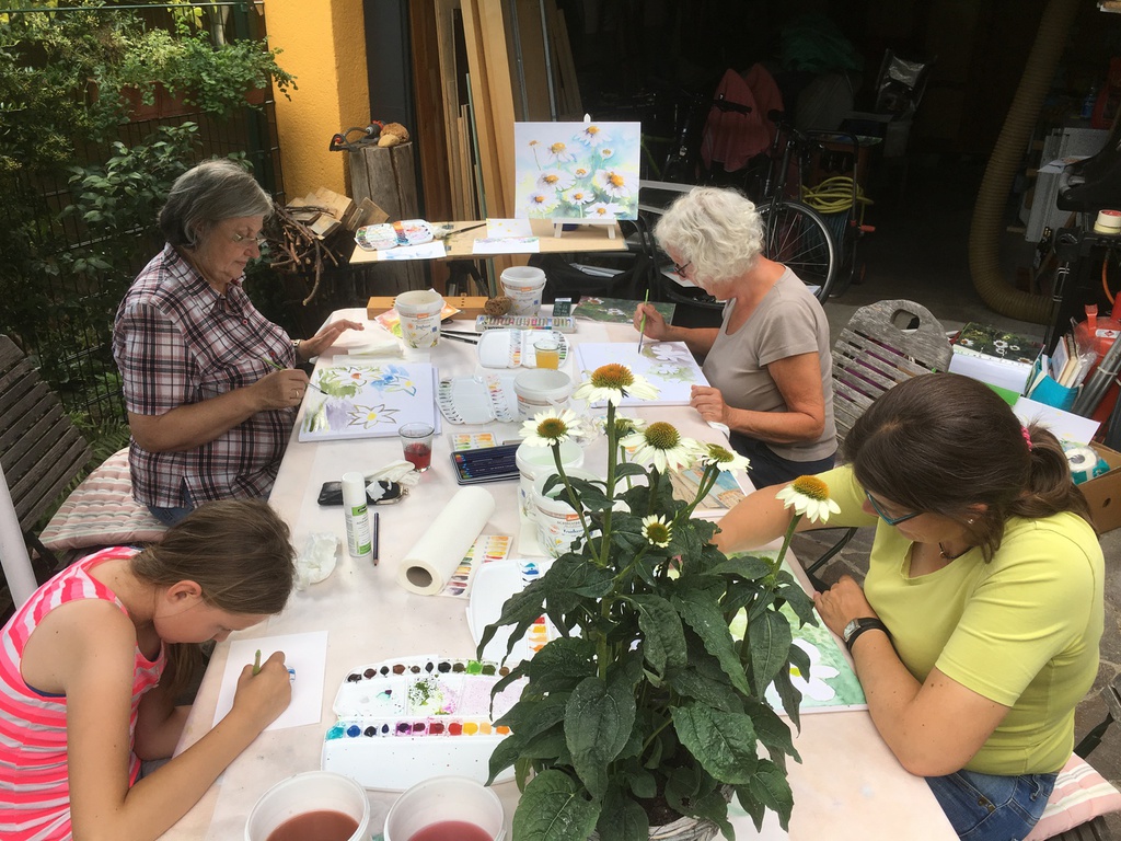Bei gutem Wetter ließ es sich wunderbar im Garten entspannen und die Kunstlehrerin Sylvia Scherer erläuterte derweil einige Details zur Aquarellmalerei. Um 15 Uhr ging es ans Malen. Die Teilnehmerinnen waren fasziniert von der leuchtenden Farbenvielfalt, den interessanten und überraschenden Effekten, die beim Ineinanderfließen der Farben entstanden. Auch unterschiedlichen Papiere, Pinsel und Hilfsmittel standen zur Verfügung und wurden getestet. Sylvia zeigte verschiedene Techniken sowie Monotypie.