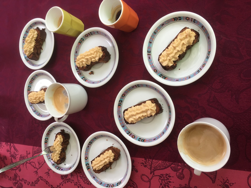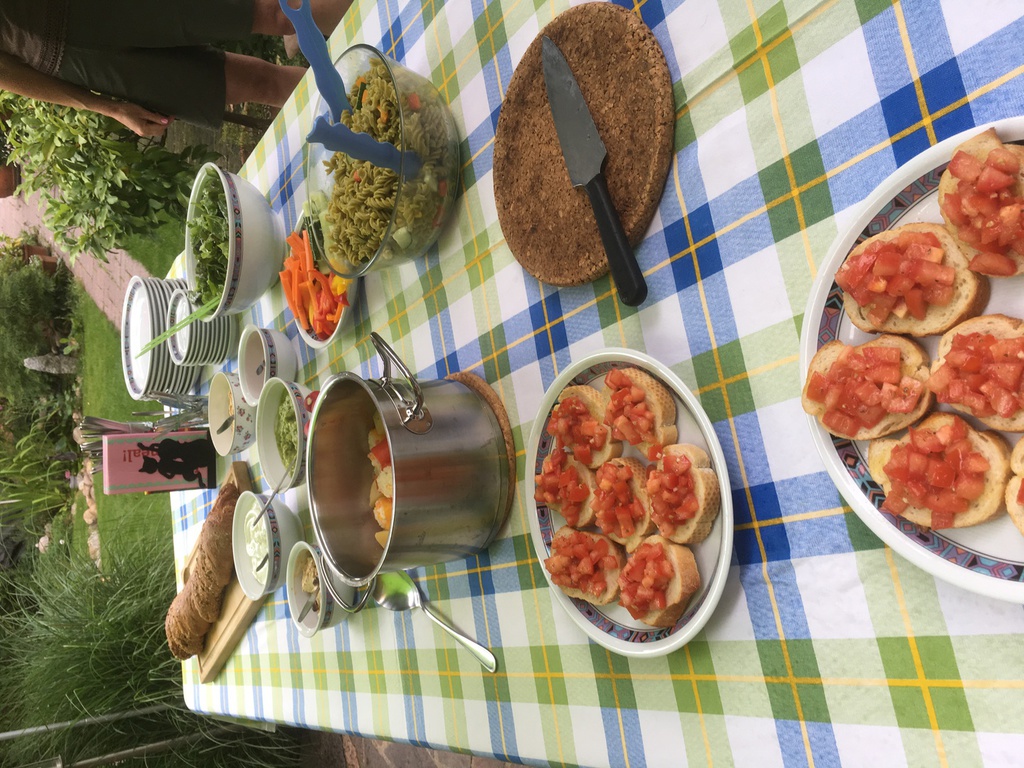 Anne Heinzler und Sophie Ott hatten täglich für 13 Uhr ein leckeres, vegetarisches Buffet zubereitet. So gab es dann zum Beispiel: Gemüsequiche, gefüllte Paprika, zwei verschiede Salate, Hummus, Guacamole, Tzaziki, Rohkost und Brot. Zum süßen Abschluss mal Tiramisu, Mousse au chocolate oder Himbeersorbet.